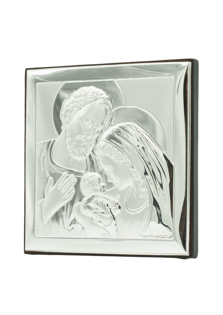 Srebrny obrazek w kształcie kwadratu z wizerunkiem Świętej Rodziny, wykonany z dbałością o detale. Stanowi wyjątkową pamiątkę i symboliczny upominek na różne okazje, takie jak jubileusz, urodziny, imieniny czy ślub.
