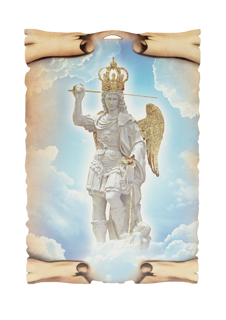 Obraz przedstawia Świętego Michała Archanioła znanego z sanktuarium na Gargano. Ukazany jest jako rzymski legionista w złotej koronie, z uniesionym mieczem i rozpostartymi skrzydłami, depczący pokonanego szatana – symbol zwycięstwa dobra nad złem. Święty Michał jest uznawany za obrońcę Ludu Bożego oraz patrona m.in. policjantów i żołnierzy. Obraz wykonany na trwałej płycie HDF. Wymiary 23 x 16 cm.